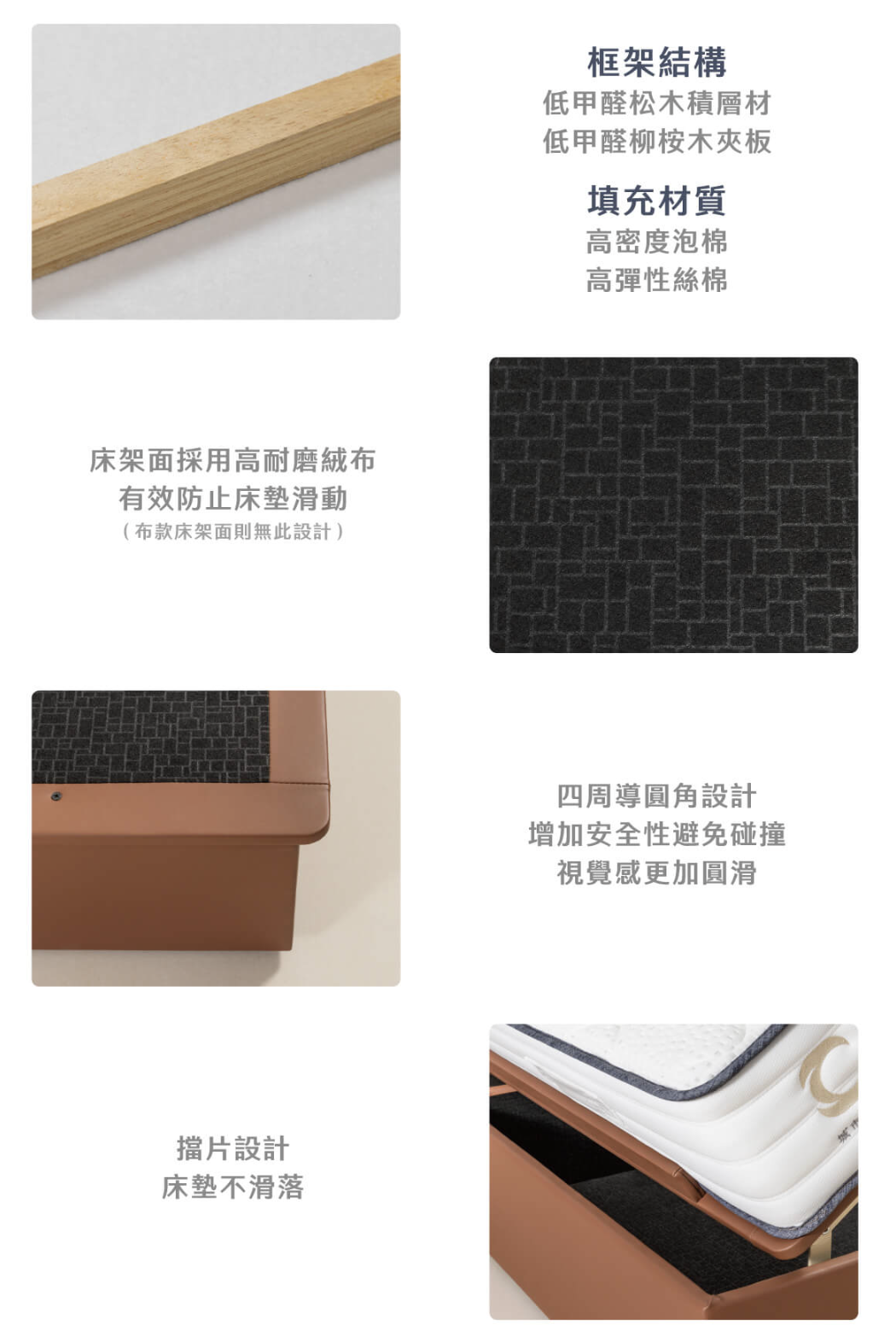 • 職人工藝軟包: 軟包泡棉設計賦予床架溫潤觸感,提供舒適倚靠,平衡了收納機能與居家美學。