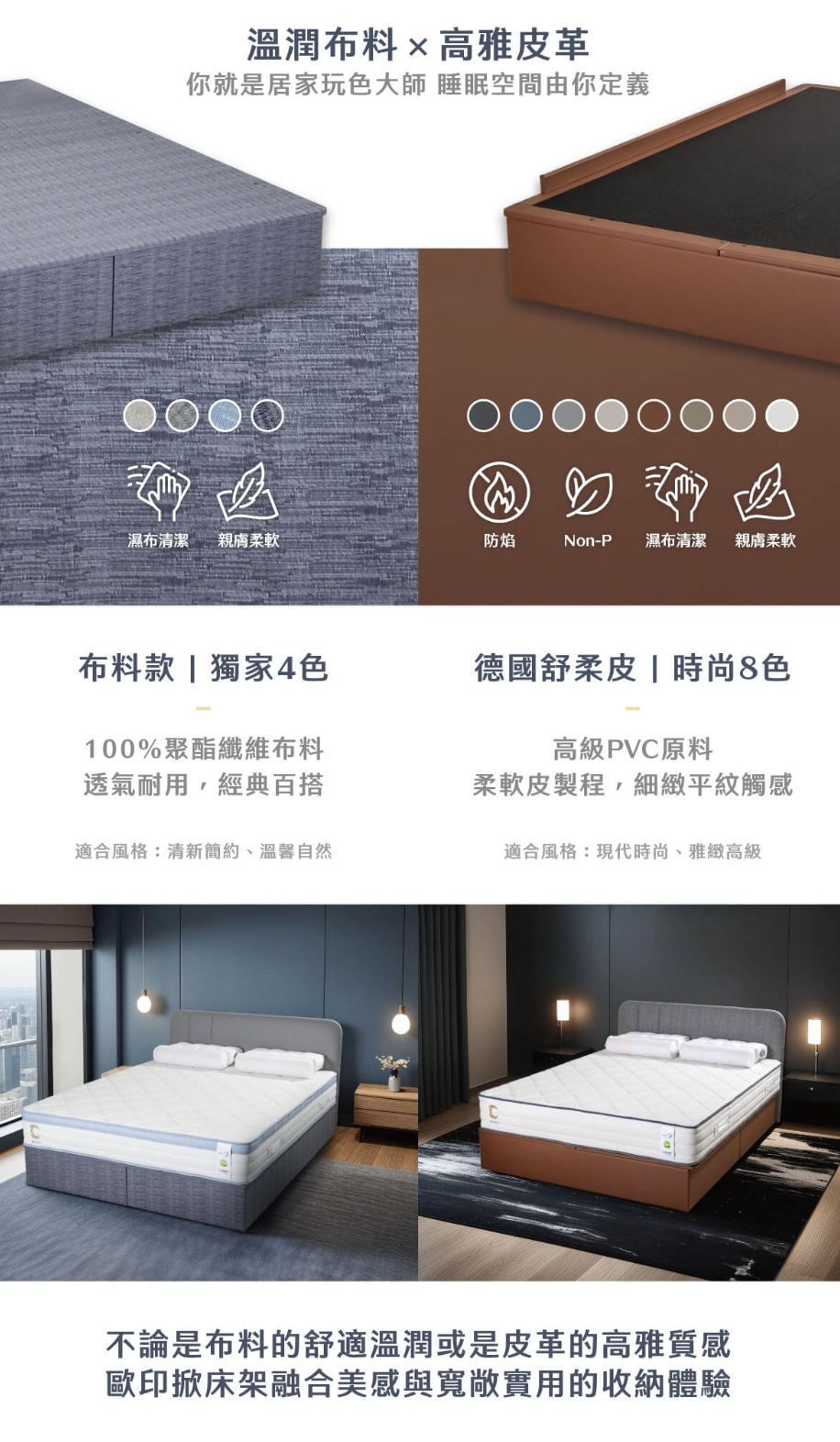 • 異材質質感選配: 提供溫潤布料與高雅皮革兩大系列。您可以化身居家玩色大師,自由定義專屬的睡眠空間。