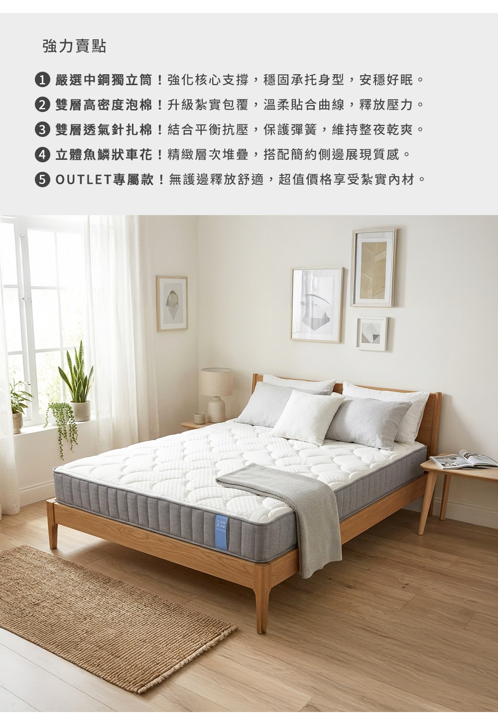• 安穩核心支撐:採用品質保證的「中鋼獨立筒彈簧」,線徑 2.0mm、圈數 6.5 圈,提供極佳的支撐力。