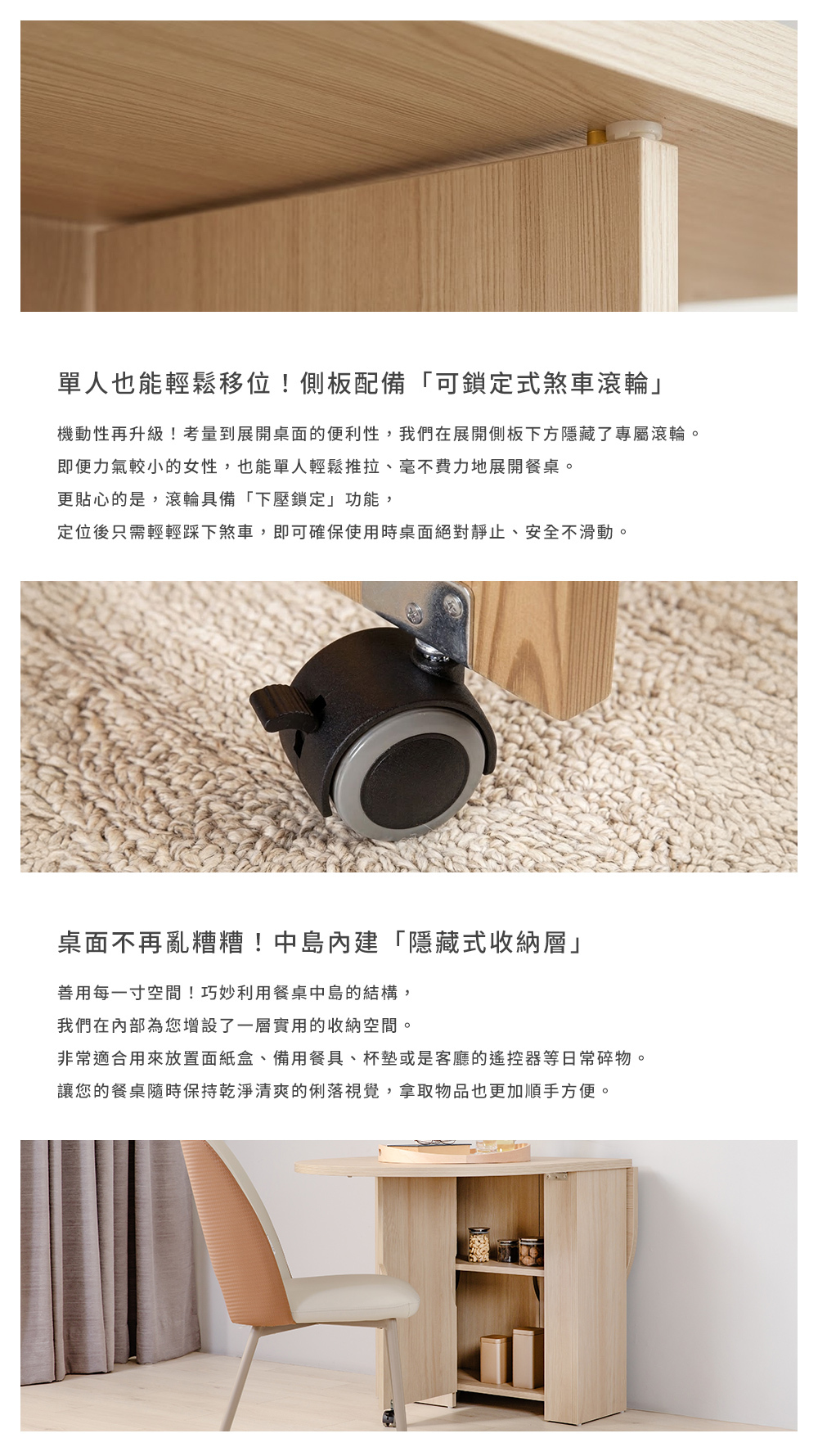 • 專屬金屬卡榫雙重加固不翻翹,中島更貼心內建隱藏式收納層。