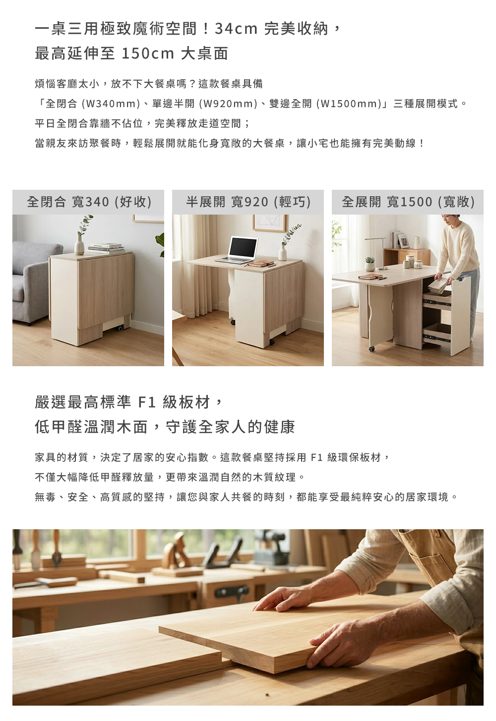 • 一桌三用 | 34-150cm 彈性伸縮,完美適應各種空間