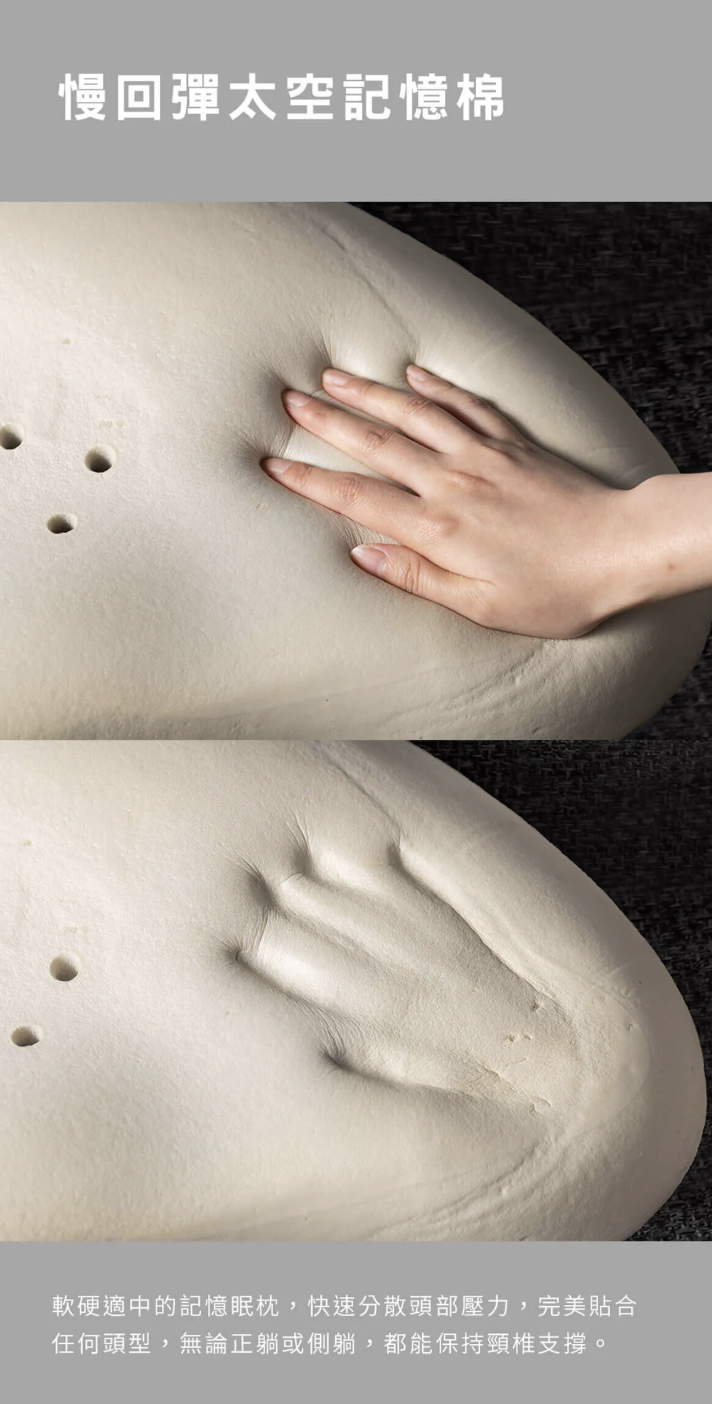 •肩頸弧度釋壓:維持頸椎黃金曲線 符合人體工學設計,完美填補肩頸空隙,有效分散頭部重量壓力,讓頸部肌肉在睡眠中徹底放鬆。