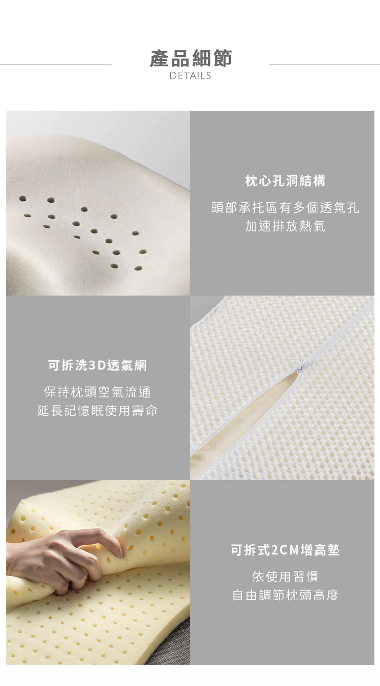 •蜂巢循環透氣:快速排熱拒絕濕黏 表層結構促進空氣流通,能迅速散發睡眠產生的熱氣與濕度,即使夏天使用也能維持頭部乾爽舒適。