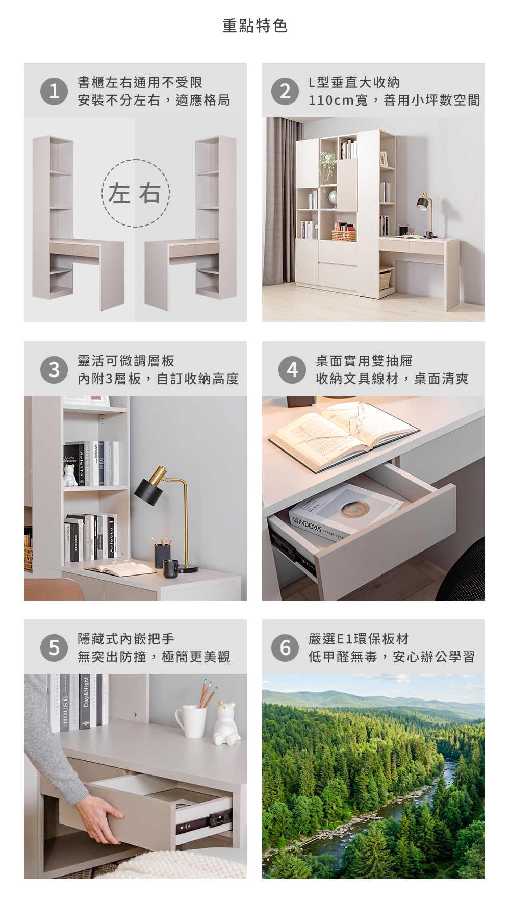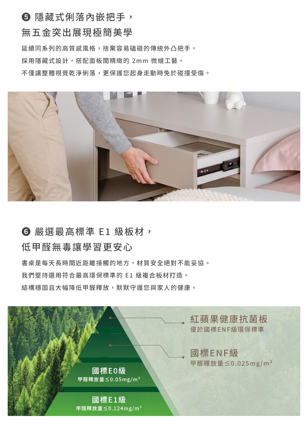 ・ 嚴選E1級環保複合板材!符合低甲醛最高安全標準,結構堅固耐用,讓全家人學習辦公都安心。