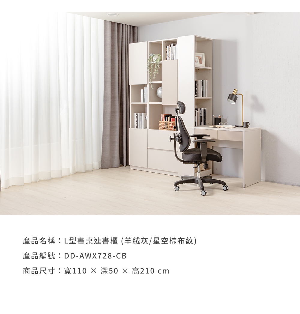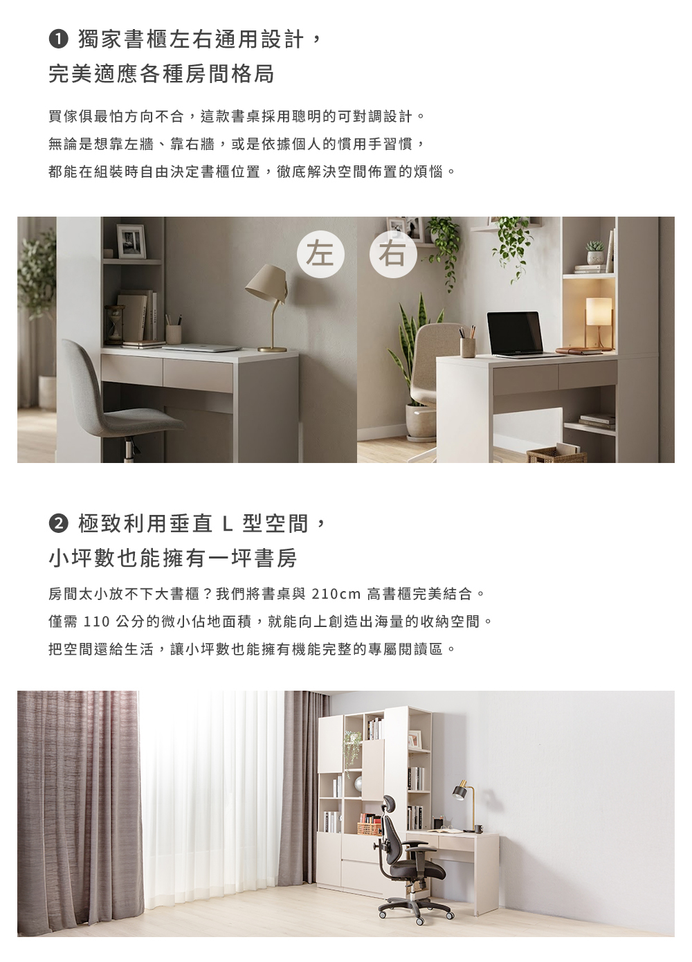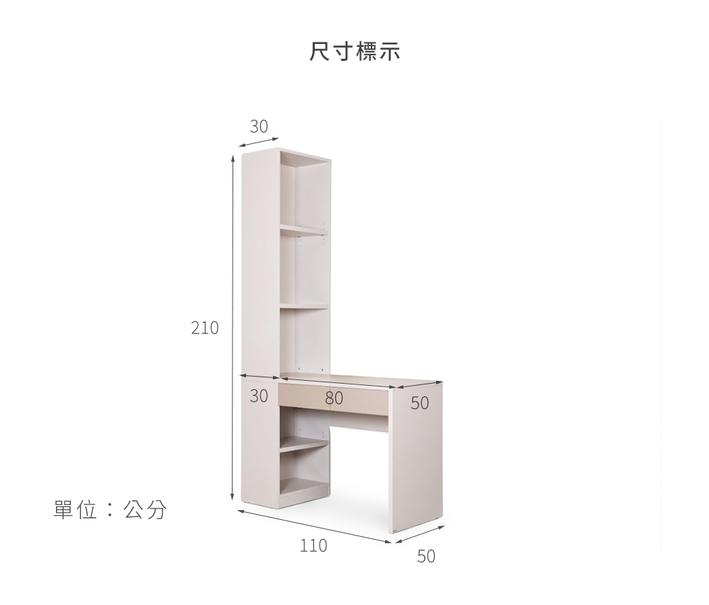 ・ 110cm微小佔地大空間!結合80cm寬實用桌面與210cm挑高書櫃,向上延伸出海量的垂直收納。