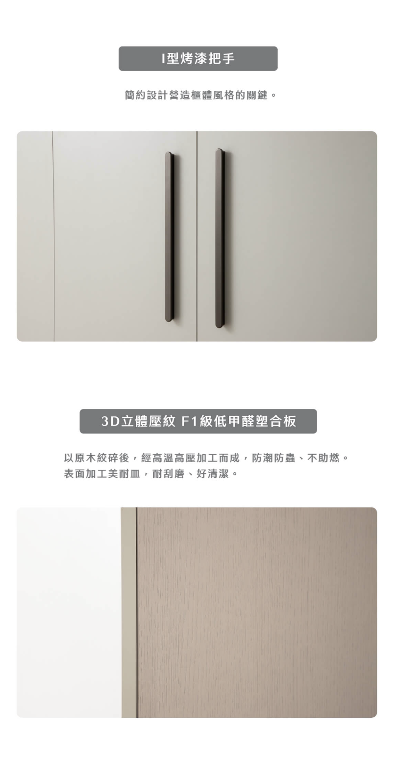 •安哥拉灰粉色櫃體淡雅木紋理、門片晨霧灰色時尚品味;譜寫溫潤質感生活。