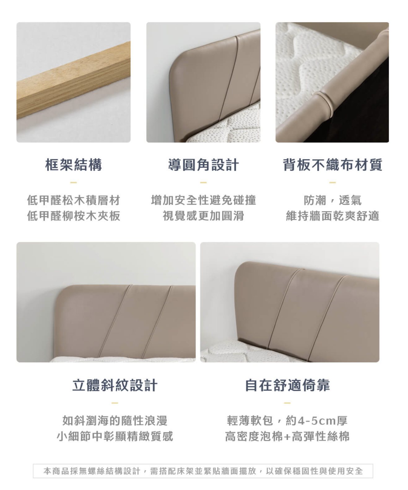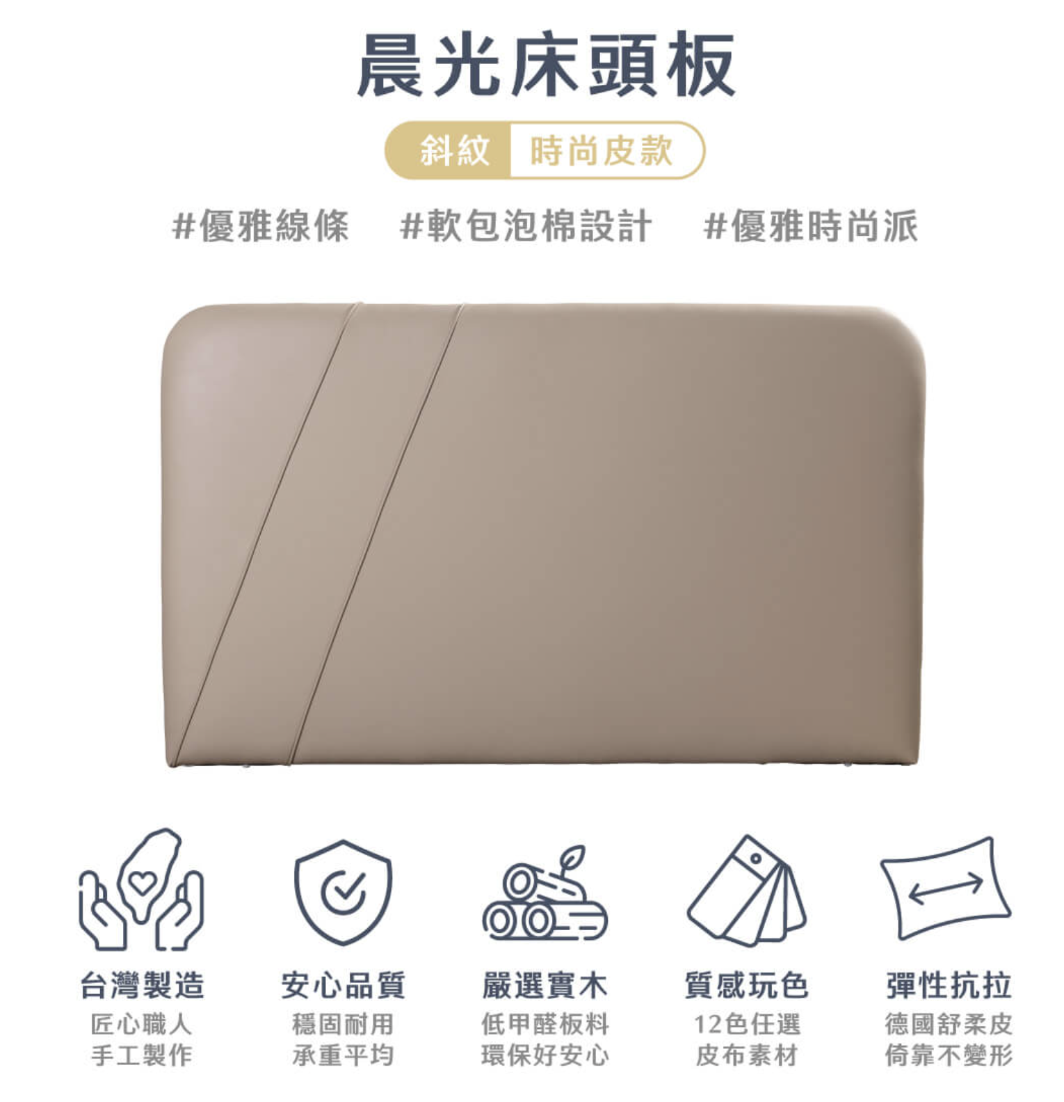 • 軟包泡棉工藝: 結合柔和的觸感與紮實支撐,提供如飯店般的舒適倚靠體驗。