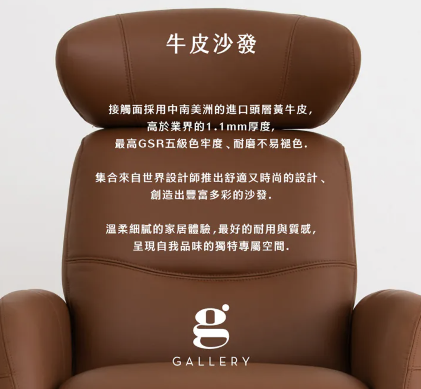 • 主要材質: 進口黃牛皮、同色系 PU、俄羅斯樺木、高密度泡綿、線圈彈簧。