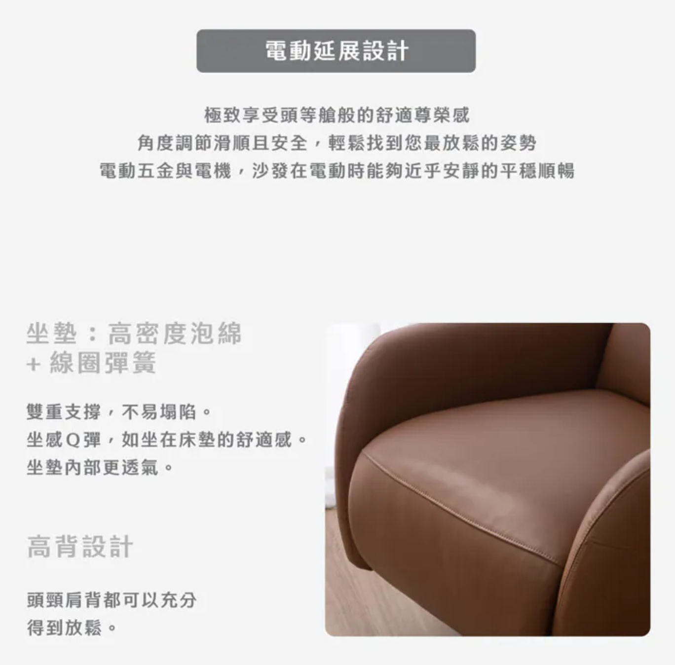 •電動五金與電機,沙發在電動時能夠近乎安靜的平穩順暢。