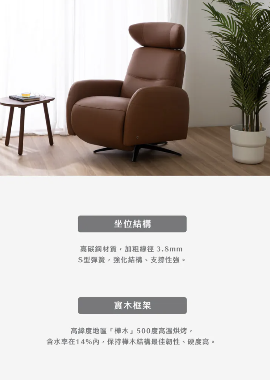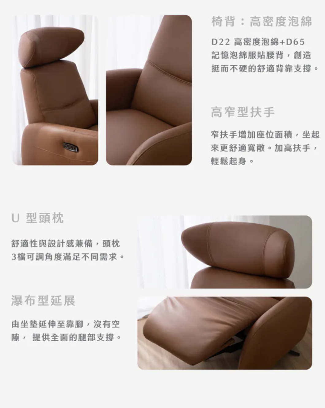 •極致享受頭等艙般的舒適尊榮感,角度調節滑順且安全,輕鬆找到您最放鬆的姿勢。
