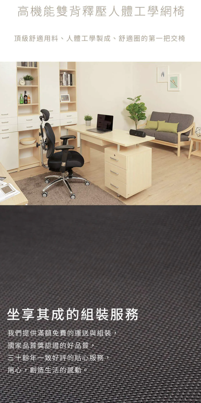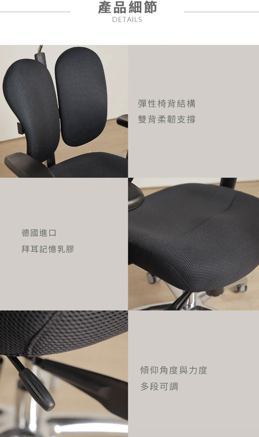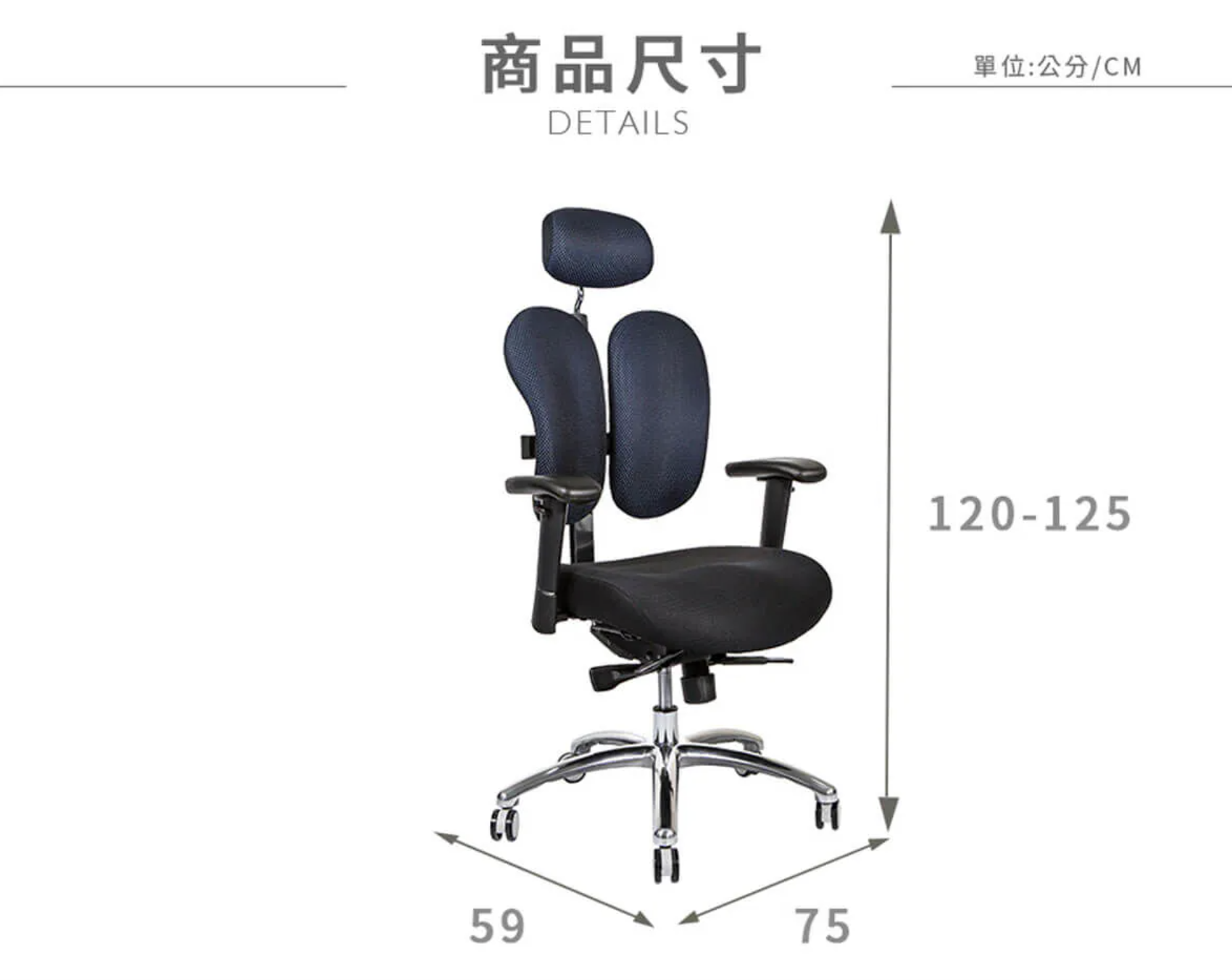 •可調性能:座高/座位深度(前後)/扶手/頭枕/椅背/傾仰角度/傾仰力度