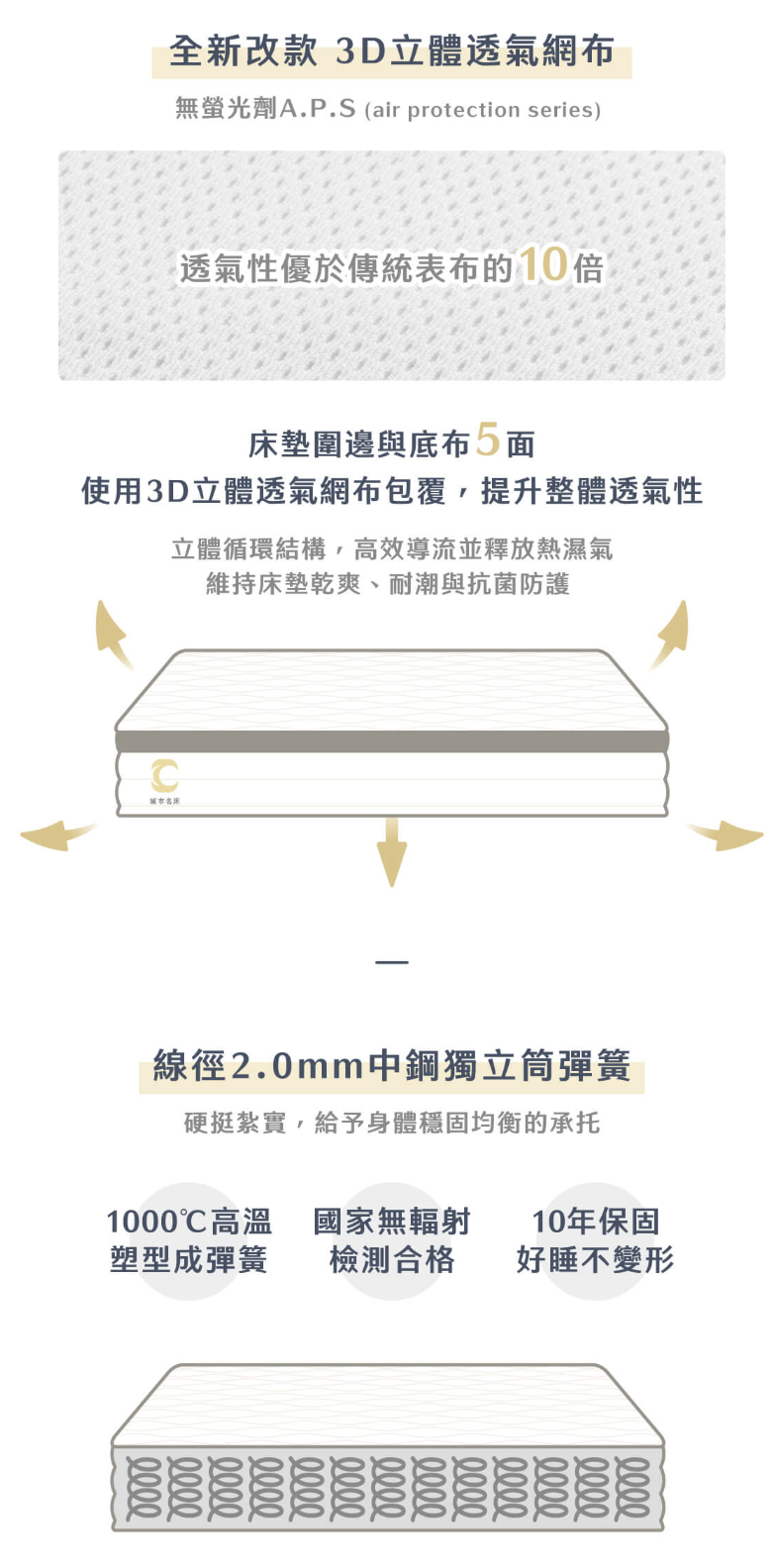 •剛剛好的支撐,打造無干擾的減壓深眠:採用高回彈支撐系統,平均釋放腰部與背部壓力,精準的支撐結構有效減少翻身干擾。
