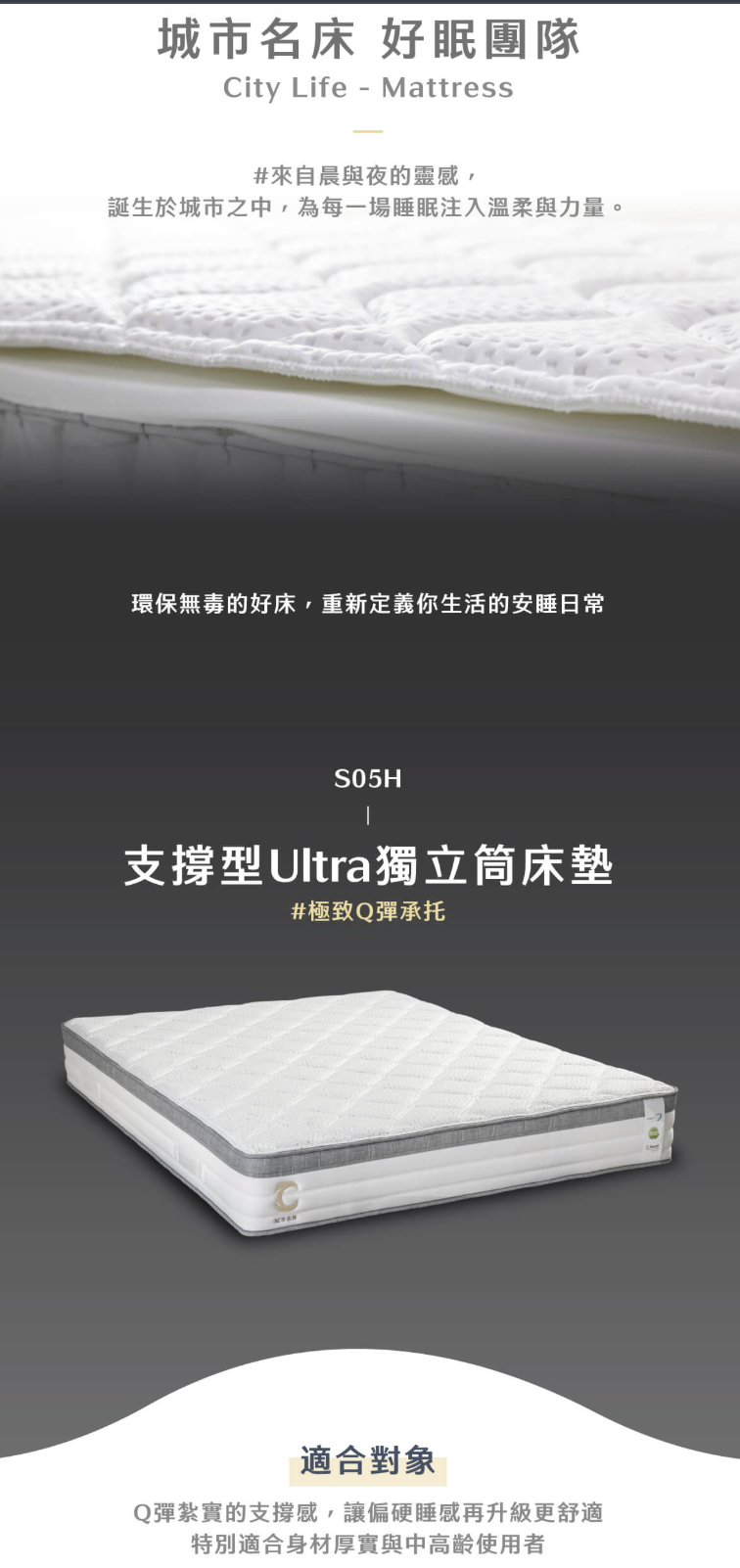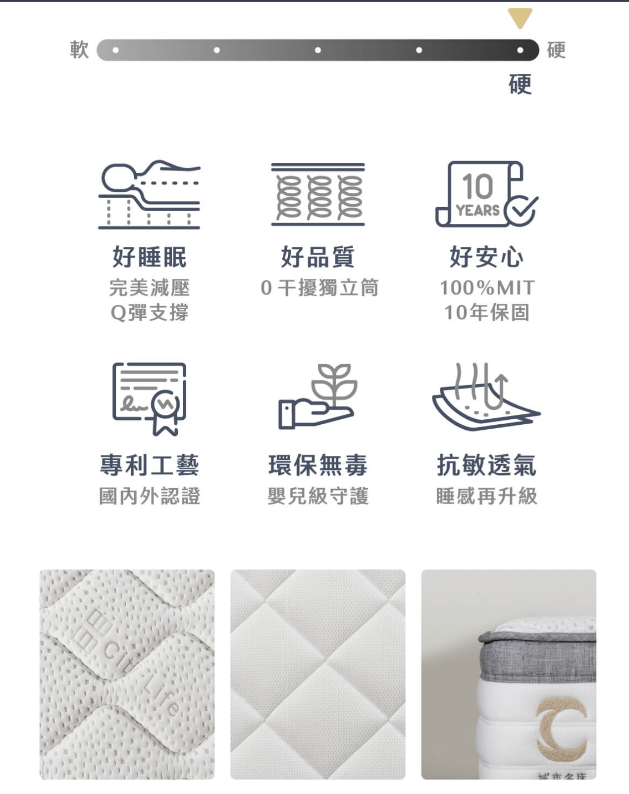 •極致Q彈承托眠:減壓升級、硬挺承托力,從Q彈紮實的支撐感,讓偏硬睡感再升級更舒適,特別適合身材厚實與中高齡使用者。