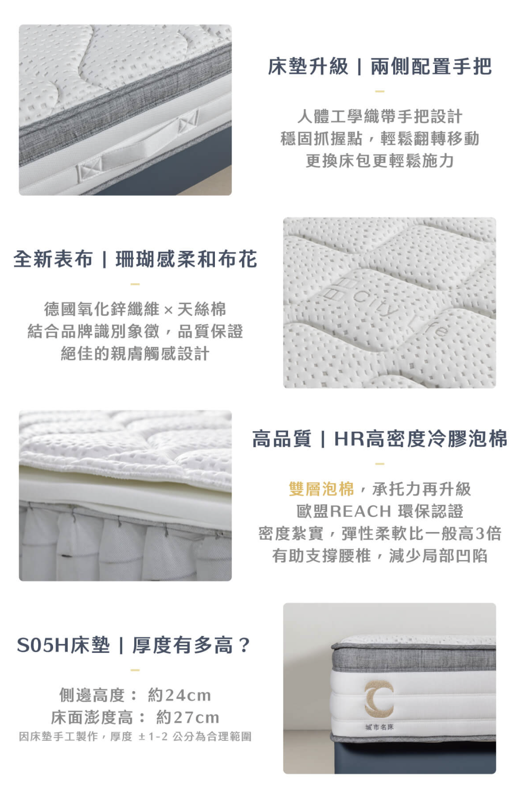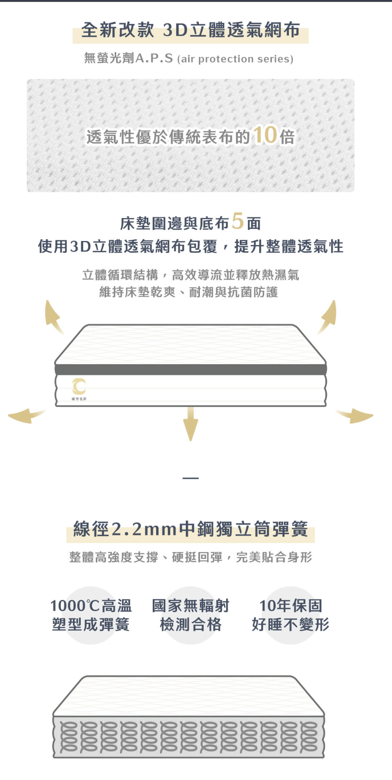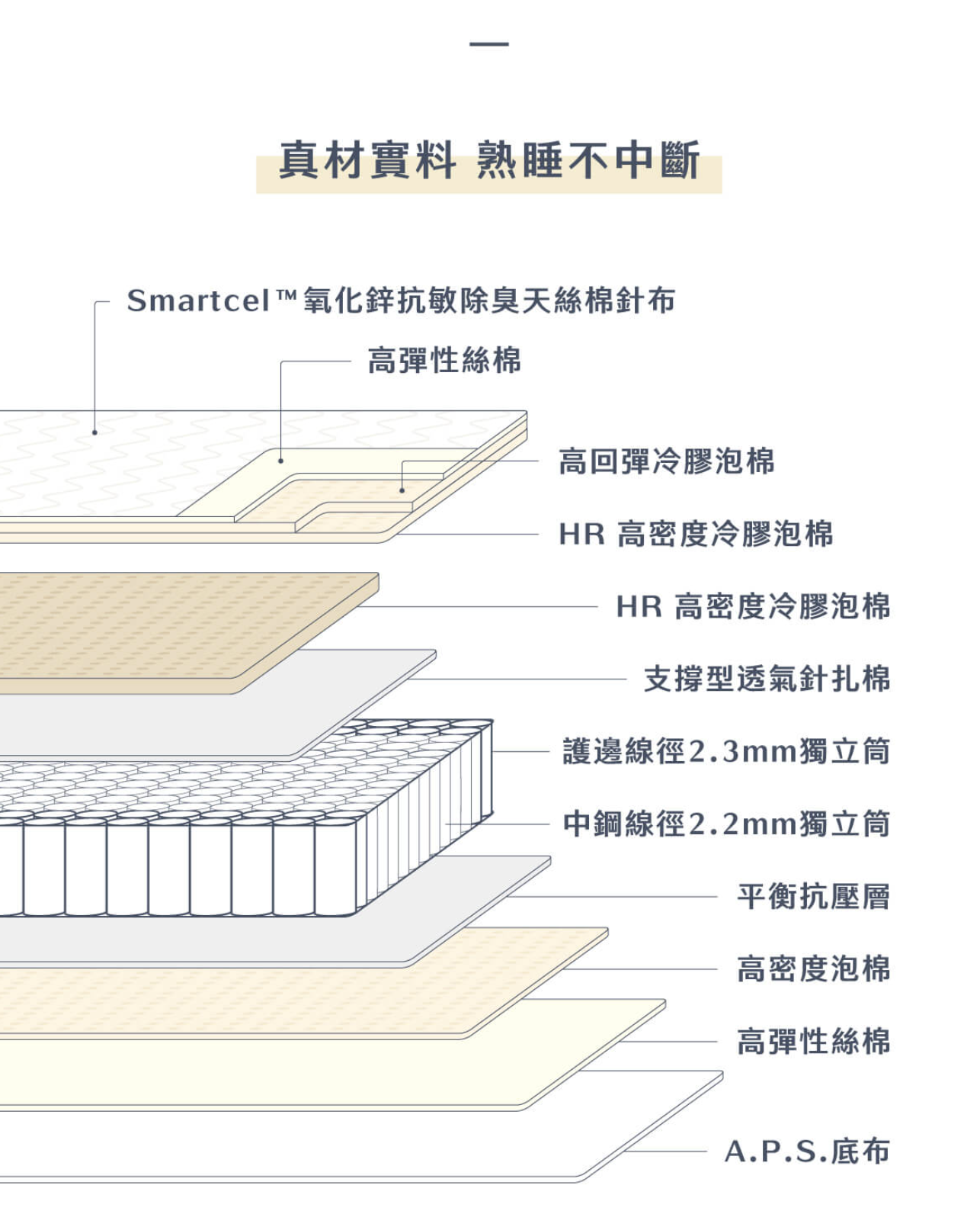 • 剛剛好的支撐,打造無干擾的減壓深眠:採用高回彈支撐系統,平均釋放腰部與背部壓力,精準的支撐結構有效減少翻身干擾。